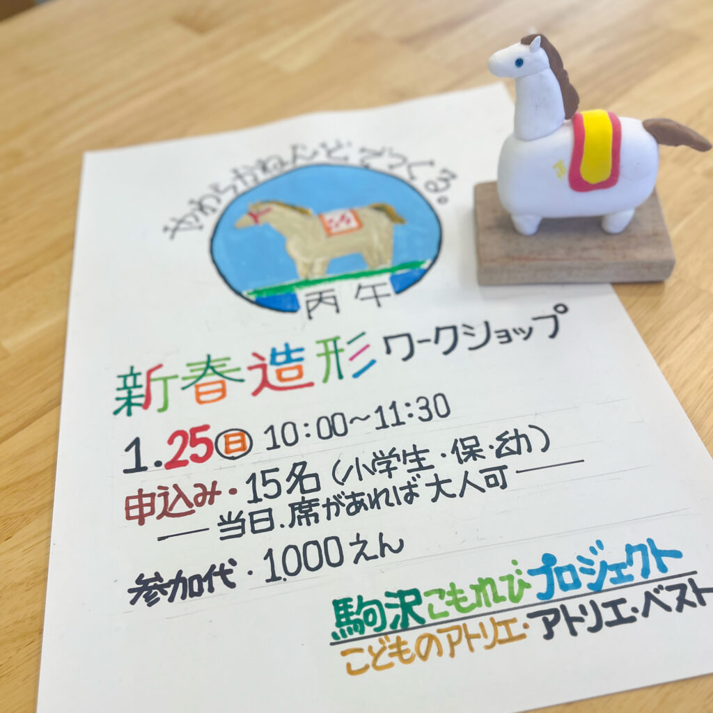 こもれびスタジオでは本日、2026年の干支「午」を粘土でつくる造形ワークショップを開催中。講師は、長年子どものアトリエ教室を運営してきた高城満丸(みつまる)先生。