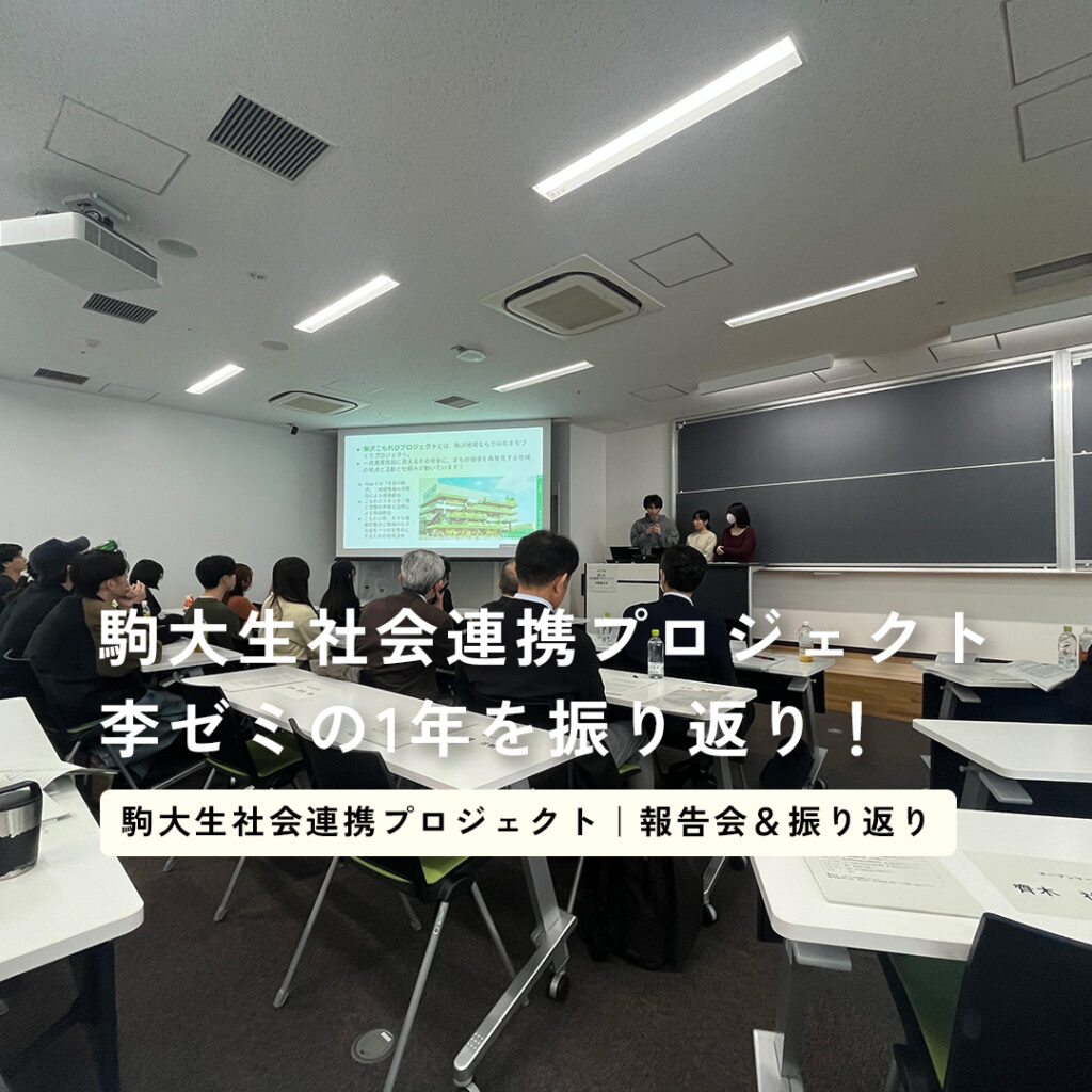 3月14日、「駒大生社会連携プロジェクト」の活動報告会が開催されました。駒沢こもれびプロジェクトとも連携してきた李妍焱(リ・ヤンヤン)先生のゼミでは、この一年、地域をフィールドにしたさまざまな取り組みが行われてきました。駒沢大学駅でのポスター掲示や公開ゼミの実施、こまざわ一箱古本市への参加など、まちの中で重ねられてきた活動の一部を振り返ります。