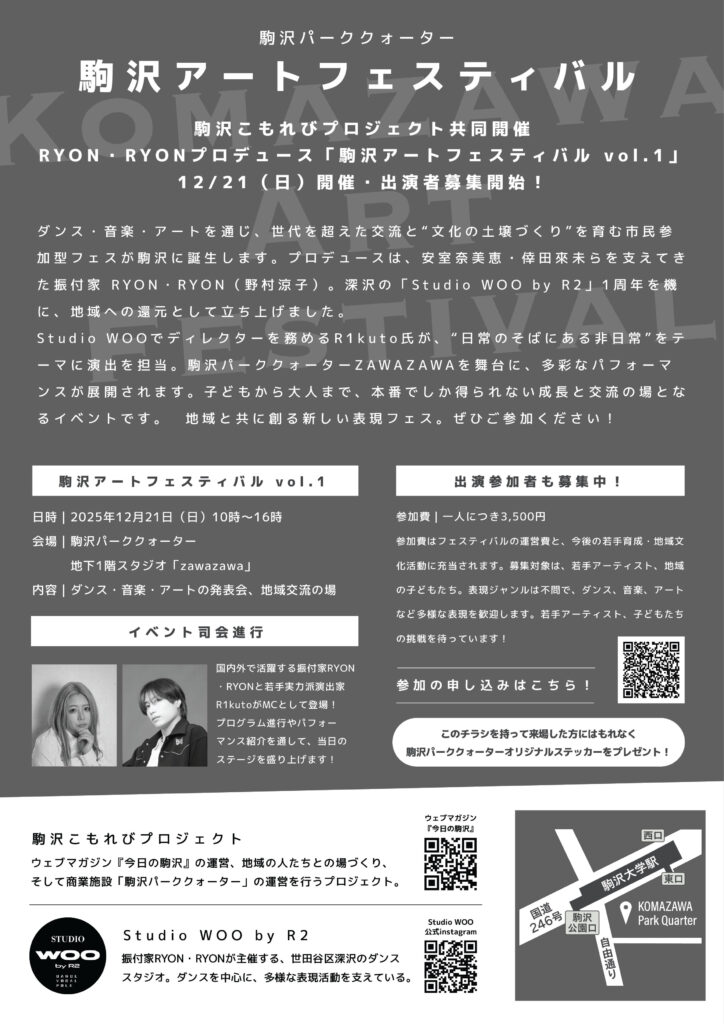 振付家 RYON・RYON と深沢のダンススタジオ「Studio WOO by R2」が企画する、世代を超えて楽しめるダンスと音楽のイベントです。当日は駒沢パーククォーター地下 1Fのスタジオ「zawazawa」を舞台に、多彩なパフォーマンスが登場。子どもから大人まで、表現の楽しさに触れられる一日です。