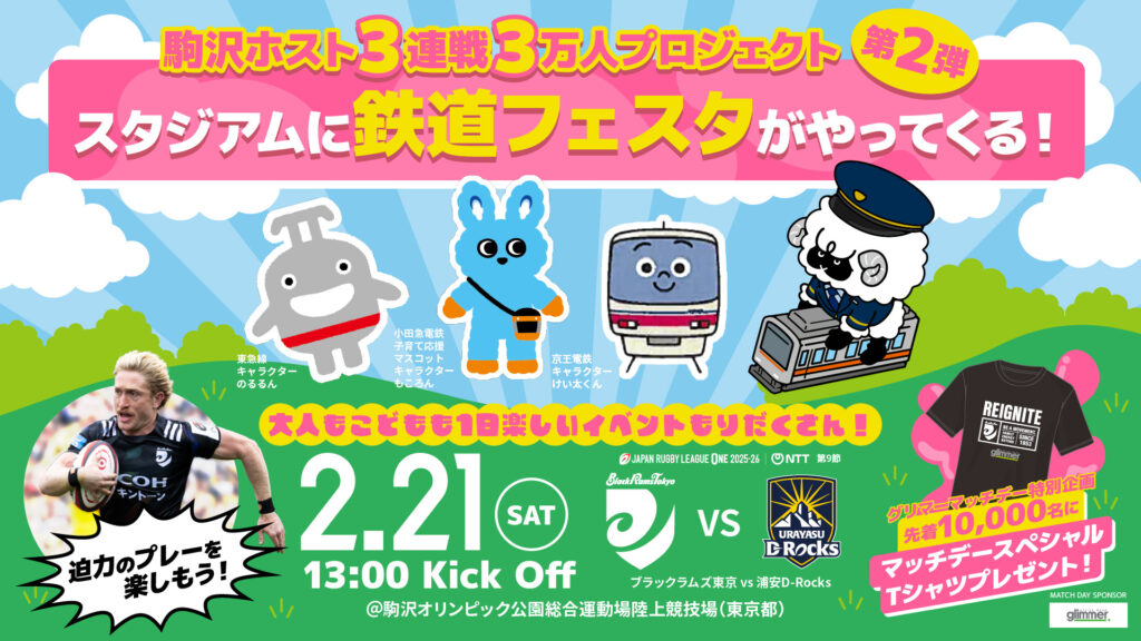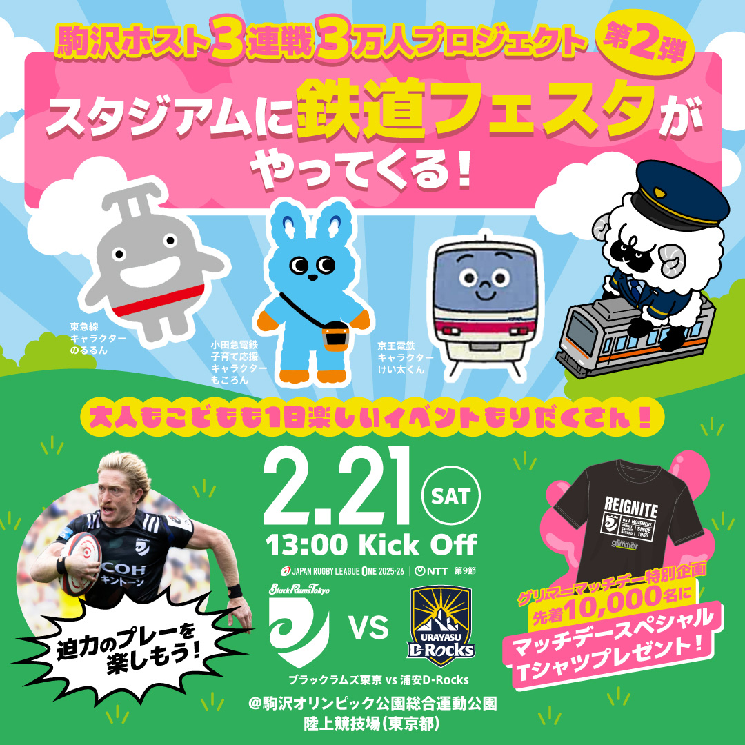 駒沢ホスト3連戦で合計3万人来場プロジェクト第2弾、本日は鉄道フェスタ!東急・小田急・京王の3社が集結し、「なりきり駅長体験」や「スタンプラリー(コンプリートで缶バッジゲット)」を実施。さらに各鉄道会社のゆるキャラと我らがラム丸も共演します!