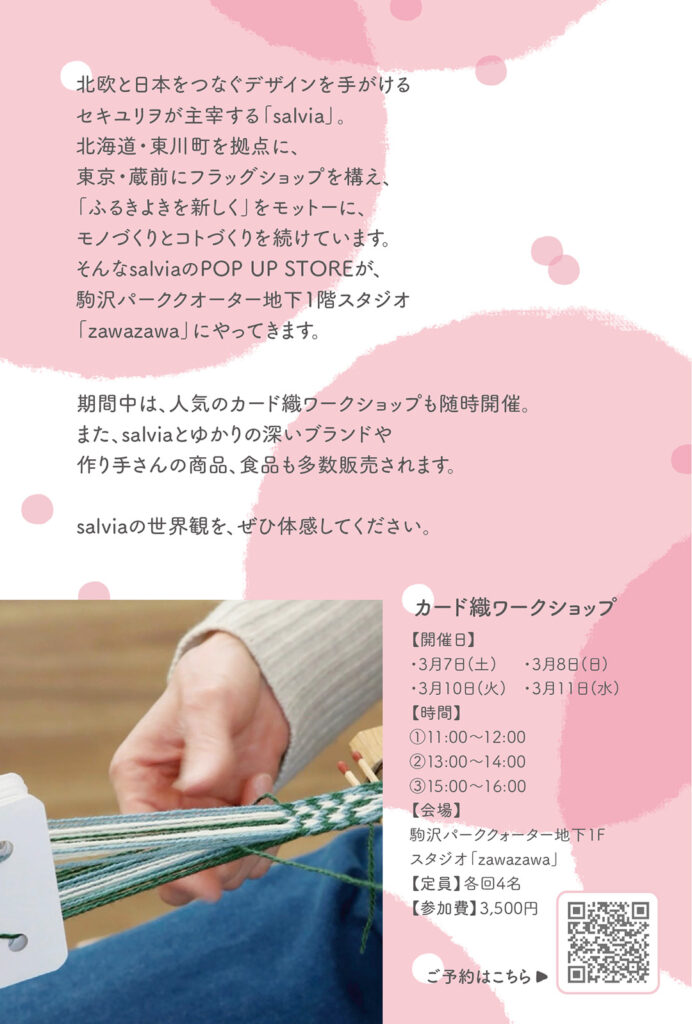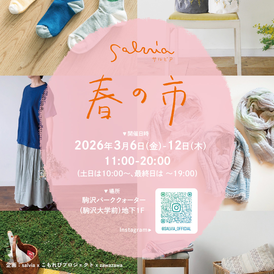 北欧と日本をつなぎ、「ふるきよきをあたらしく」モットーにデザインを届ける「salvia」。デザイナー・セキユリヲが主宰する「salvia」のポップアップ「春の市」が、3月6日(金)〜12日(木)駒沢パーククォーター地下1F・zawazawaで開催されます。人気の靴下やテキスタイル小物が並び、会期中はカード織りワークショップも実施。興味のある方はぜひ申し込んでみてくださいね。