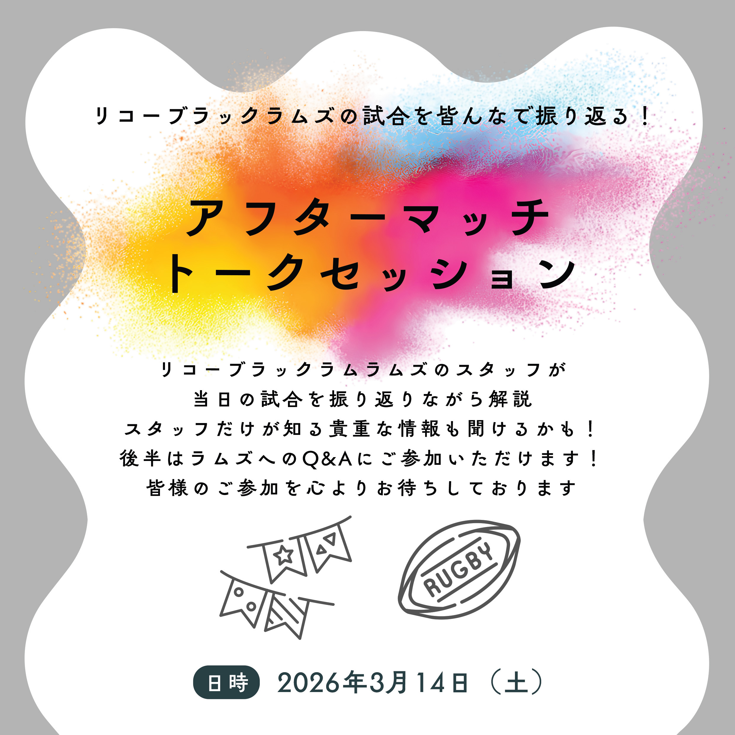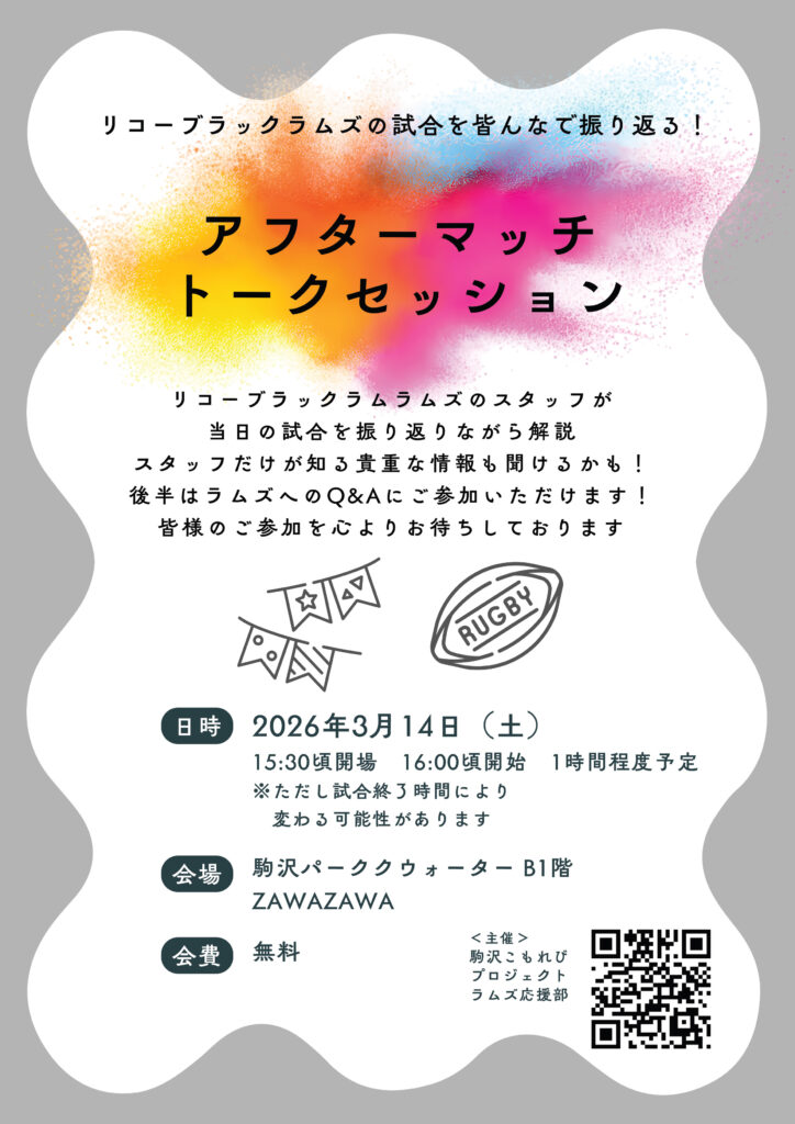 3月14日(土)に行われるブラックラムズ東京 vs 静岡ブルーレヴズ戦の試合終了後、ブラックラムズ東京のスタッフをお招きし、試合の裏側を語るトークイベントを開催します。