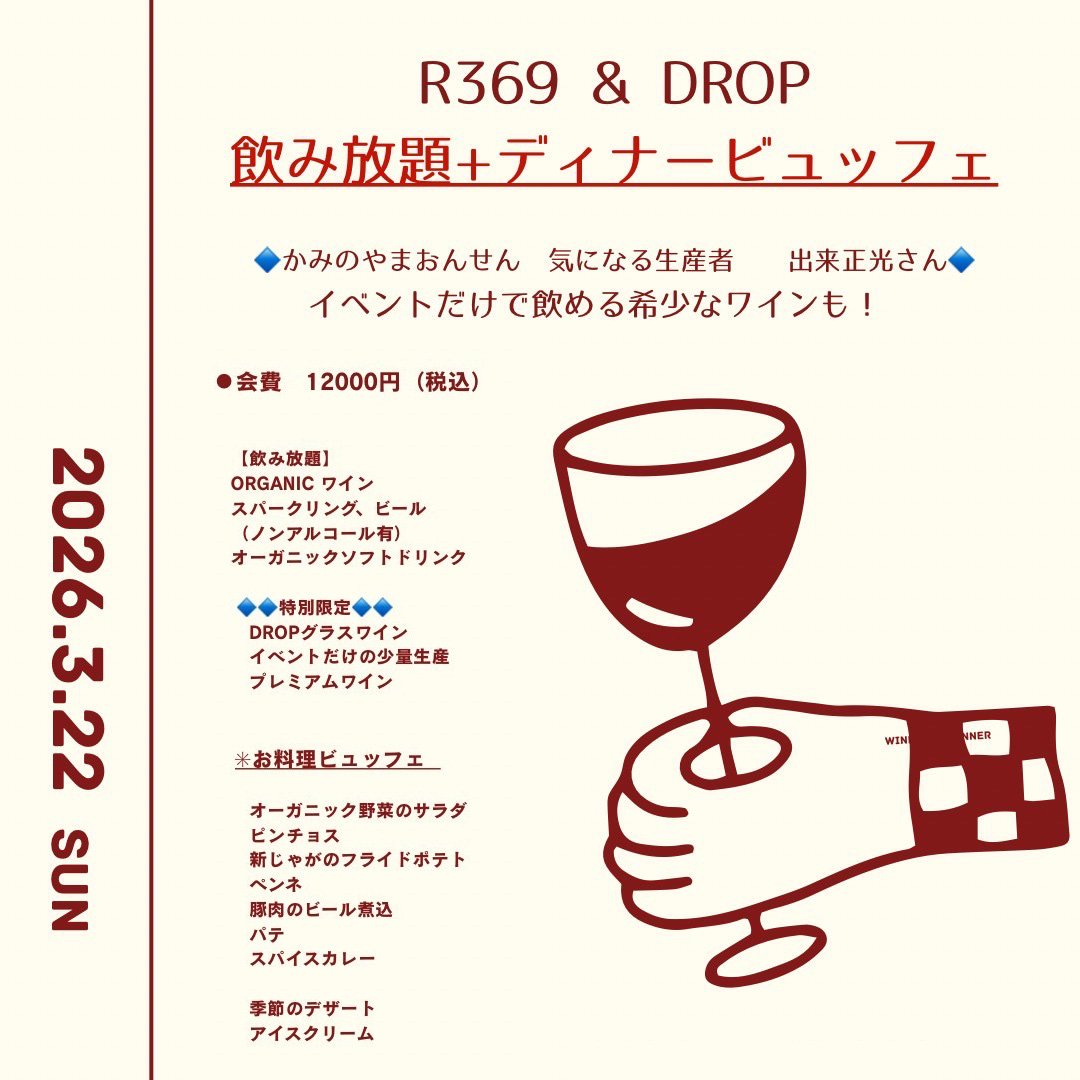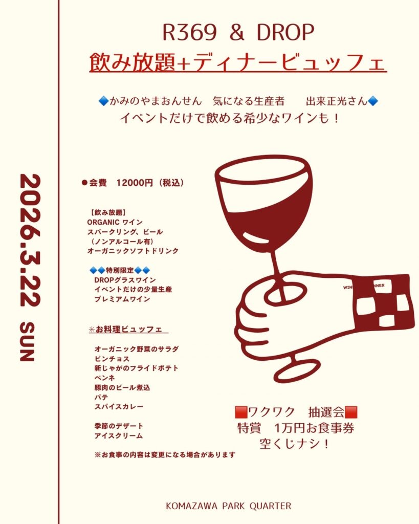 3月22日(日)、駒沢パーククォーター2階のR369(アールみろく)で「R369 × DROP ワイン飲み放題+ディナービュッフェ」が開催されます。