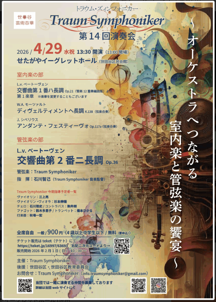 4月29日(水・祝)、世田谷区民会館「せたがやイーグレットホール」にて、「Traum Symphoniker(トラウムズィンフォニカー)」の第14回演奏会が開催されます。日本語で「夢交響楽団」を意味する同楽団は、2012年発足のオーケストラです。