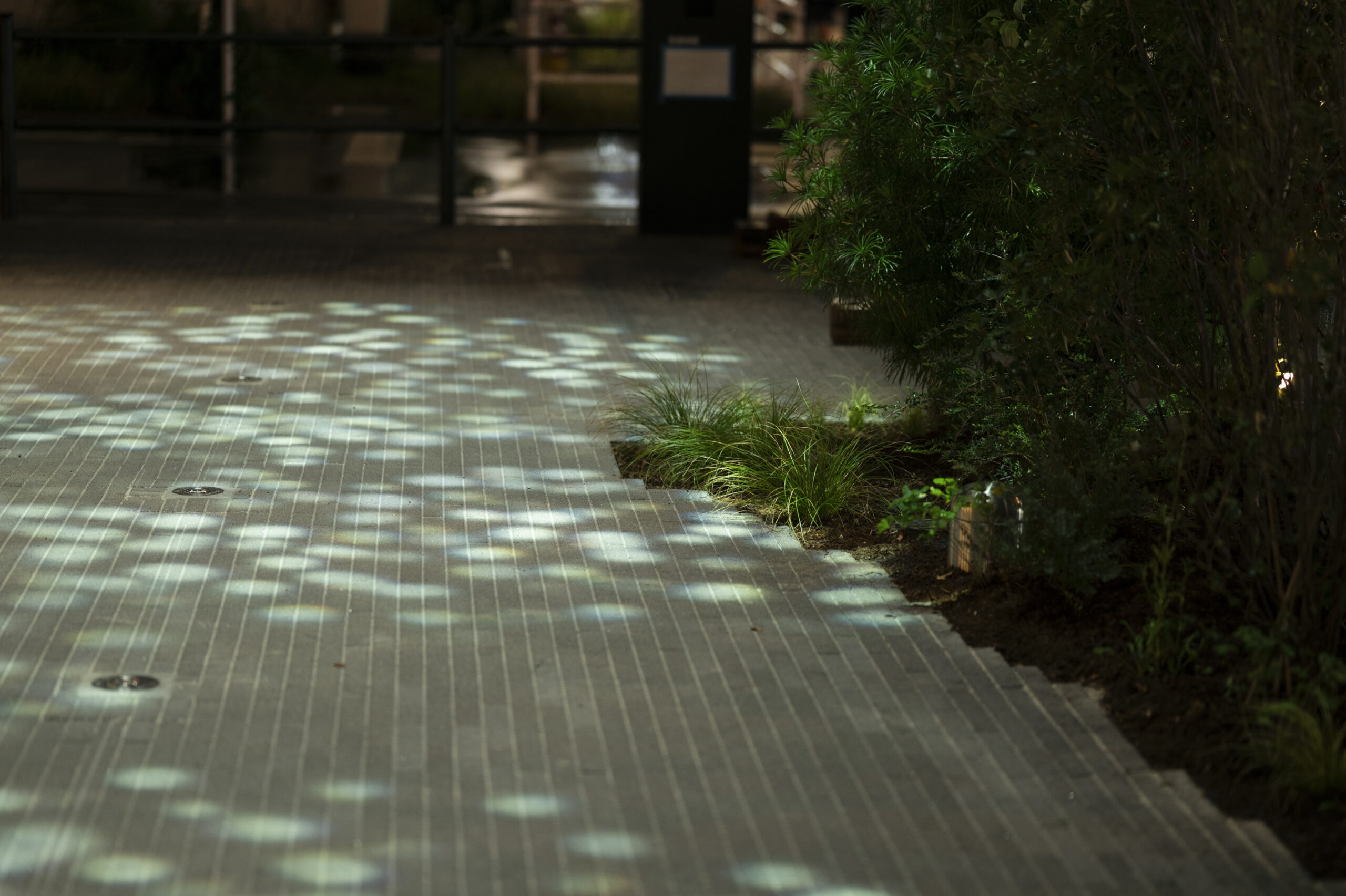 寺田 確かにそうですね。施工中はそう(マッシブ)見えてたんですけど、電気がついて、テナントさんの照明もついた瞬間に、ガラス越しに奥行きが感じられるようになって、全然印象が変わりました。スラブが地面から盛り上がってきて、その中にいろんな部屋や空間が見えるアリの巣のような地層を覗いている感じがして、すごくワクワクしました。この土地の持ち主はIMAXさんですが、プロジェクトリーダーの齋藤さんとも「地層が積み重なっているような感じが面白いですね」と話していたんです。
