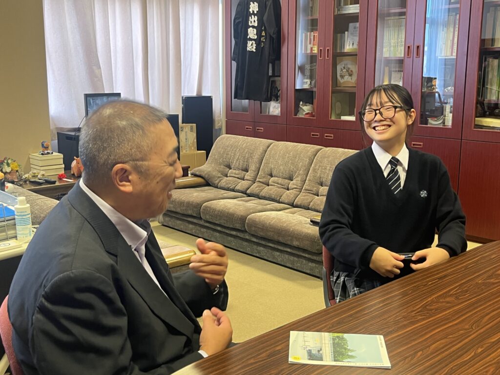 駒沢こもれびプロジェクトに職業体験に訪れた東深沢中学2年の相原凛さんと大谷柚月さん(2025年11月の初め)。インタビューも取材も未経験の2人が、知っているようで知らない学校の先生を取材しました。大谷さんが取材したのは校長先生! 校長室に入るのも実は、はじめてとのこと。どんなお話が聞けたのでしょうか。