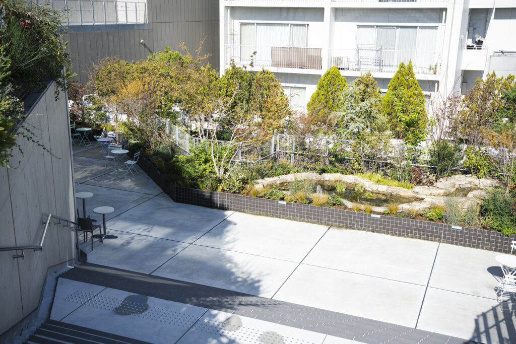 2Fの「ビオトープ」には、庭のような池と植栽のスペースがあり、周りのイスのや階段で佇むことができます。どんな植栽が植えられているのかは、そばにあるパネルをチェックしてみてくださいね。