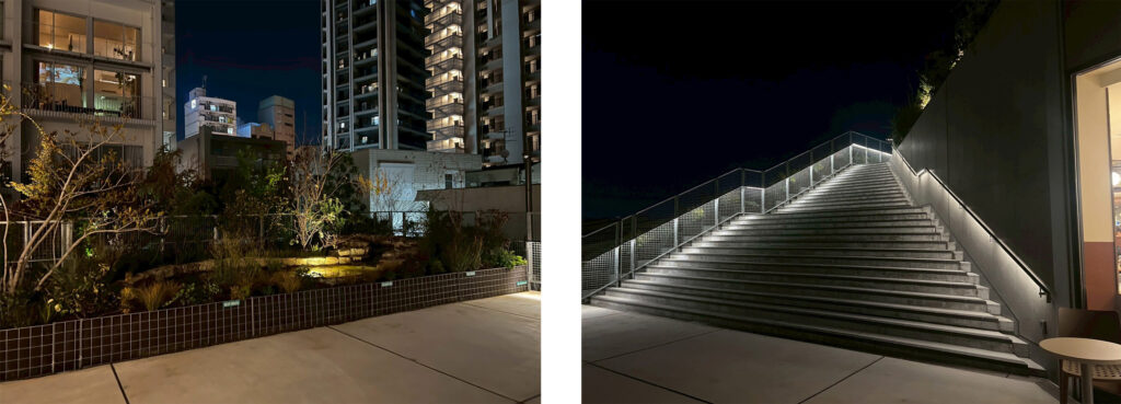 さらに夜になると、地面にこもれびのような照明がキラキラと降り注ぐ場所が出現。いくつかあるので、ぜひ歩いて探してみてください。幻想的な写真を撮ることができますよ。