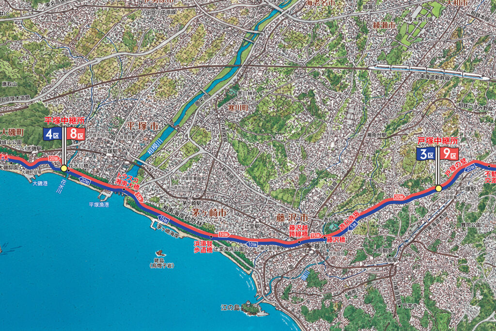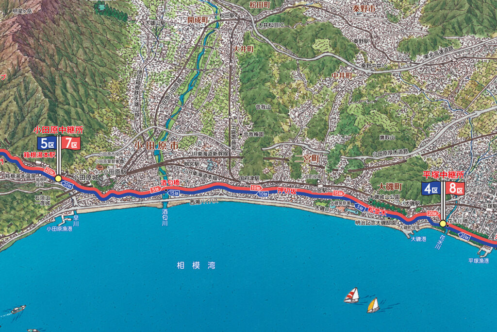 序盤はおよそ9kmにわたって下りのコース。市街地を抜け、11km過ぎに国道134号へ入ると、正面には富士山、左手には相模湾が広がる、箱根駅伝屈指の景観区間に差しかかります。海沿い特有の強い向かい風が吹くことでも知られる区間です。