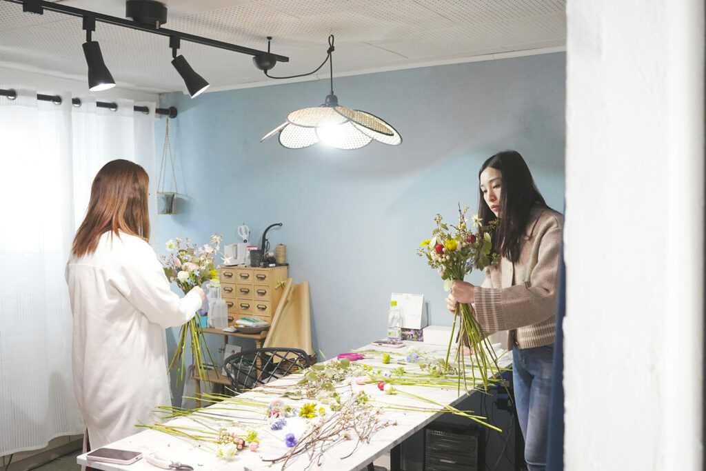フラワーレッスンは「技術を学ぶ場」であると同時に、心を整えためのサードプレイスでありたい。そんな想いで空間づくりやレッスン内容を工夫しています。