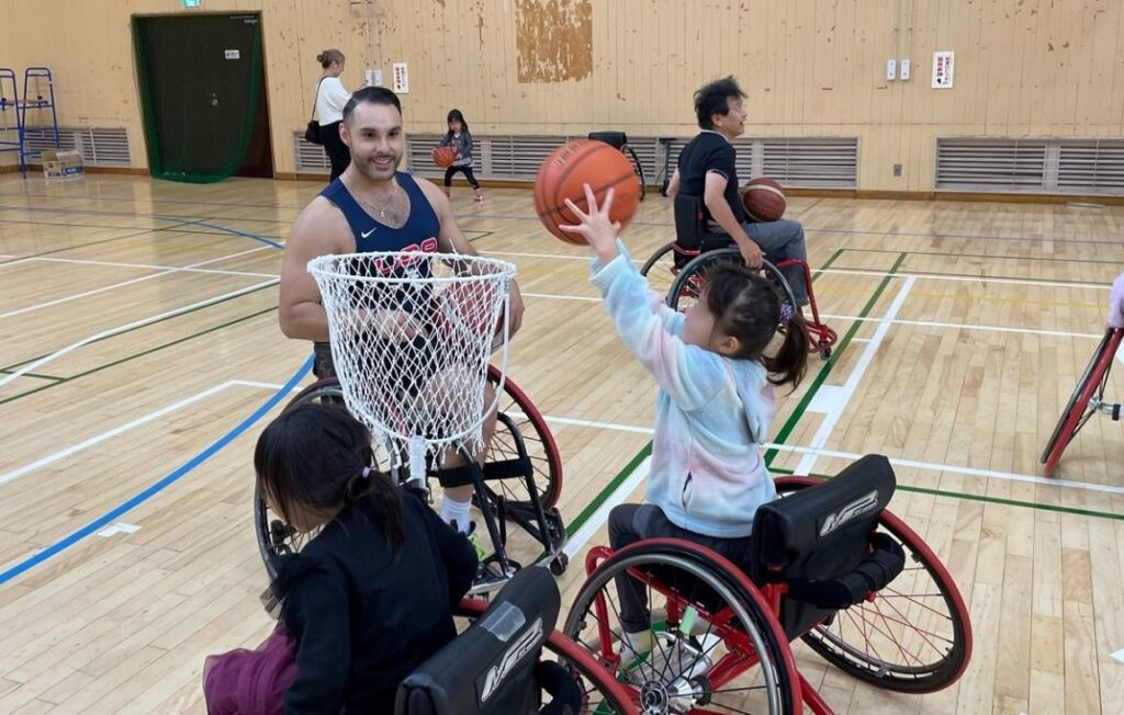 ラグビーボールを投げて的を当てるパスターゲットゲームや、車いすバスケットボールの体験ができます。