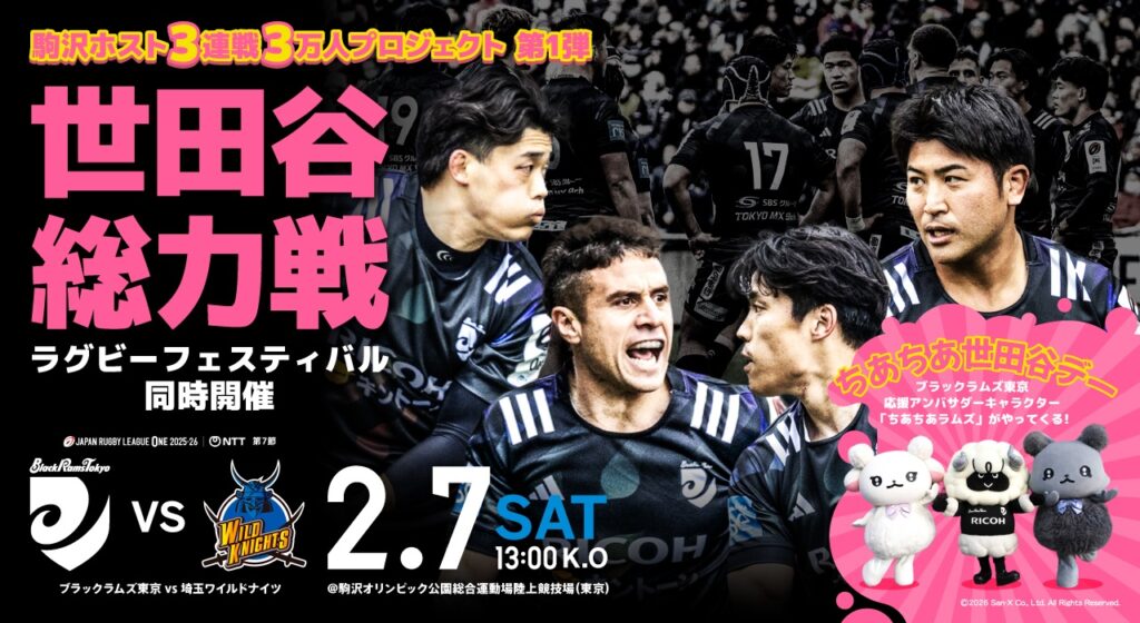 現在リーグワン首位の埼玉ワイルドナイツとブラックラムズ東京の試合が駒沢オリンピック公園の陸上競技場で開催! リーグ屈指の防御力を誇るチーム相手に、ブラックラムズがどのような攻撃を繰り出すかが注目の一戦です。当日は「ちあちあラムズ」が応援に駆けつけ、ラムまると一緒に会場を盛り上げます。