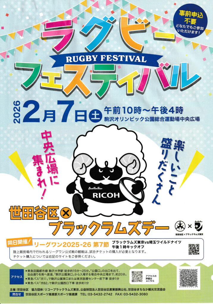 2月7日、駒沢オリンピック公園で「世田谷区×ブラックラムズデー ラグビーフェスティバル」が開催されます。当日はラグビーリーグワン第7節のブラックラムズ東京vs埼玉ワイルドナイツの試合が13時にキックオフ! 熱い闘いが開始される前から、駒沢公園の中央広場ではさまざまなブースや企画が楽しめます。この記事ではどんな体験があるのかをご紹介します。