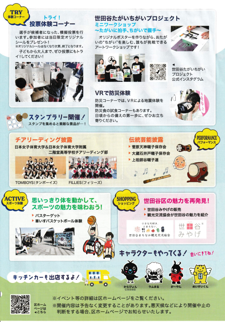 世田谷区が主催する体験コーナーでは投票・防災・アートなど、幅広いジャンルが揃います。