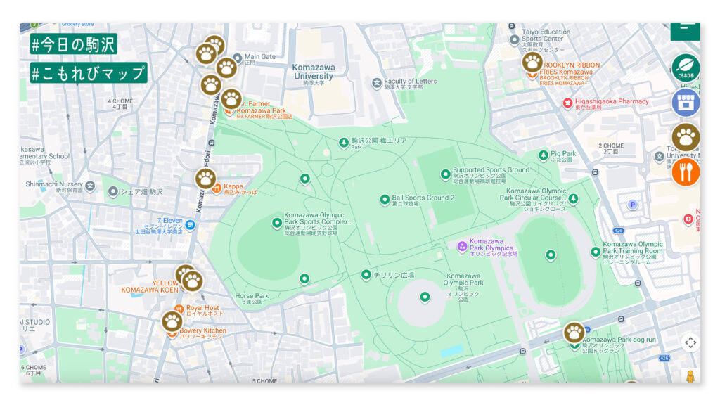 『今日の駒沢』ではわんちゃんと一緒に行けるカフェやお店をマップとして確認することができます。駒沢オリンピック公園周辺には多くのお店が並んでいるので、メニューの「COMOREVI MAP」からご覧ください。