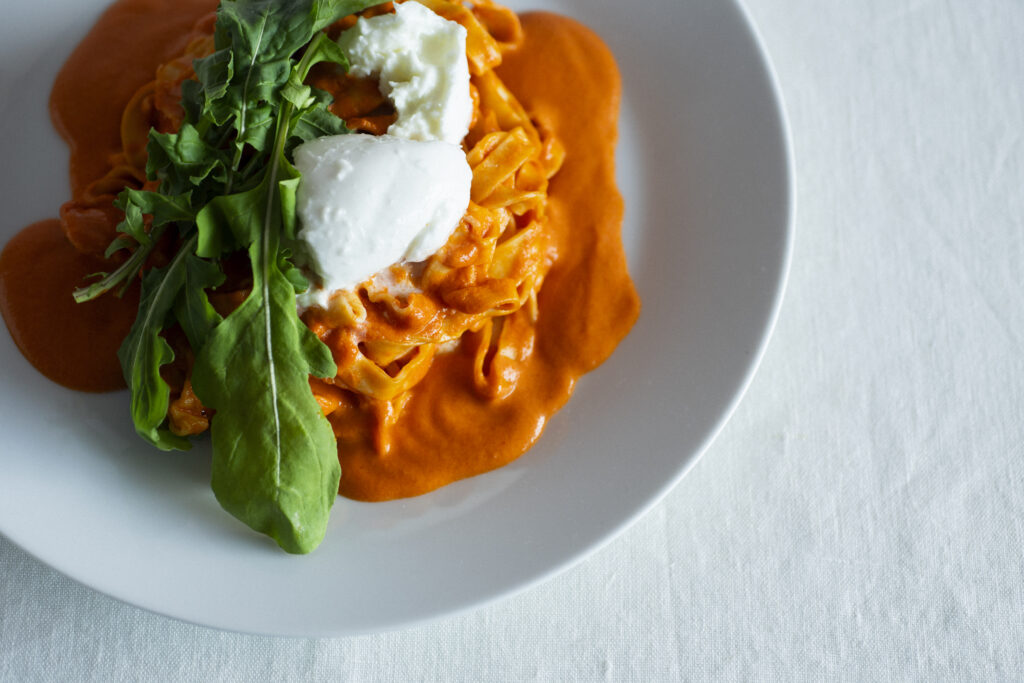 自家製の全粒粉の生パスタを楽しめるパスタランチ。爽やかな酸味のトマトソースと濃厚な味わいのブラッターチーズは相性抜群です。モチモチのパスタにたっぷり絡めて楽しんでください。