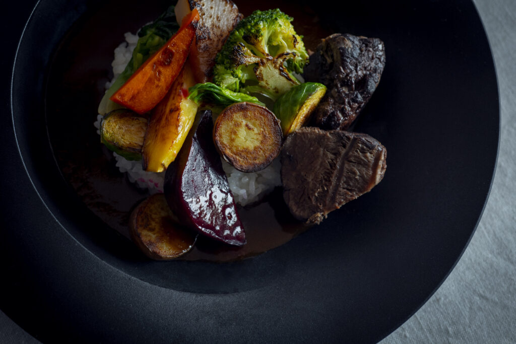 「幸生牛」と季節の野菜を楽しめるカレーランチ。インドの高級ガラムマサラを使用したスパイシーなカレーは病みつきになること間違いなし。付け合わせのピクルスは、ひと味違ったおいしさを演出します。