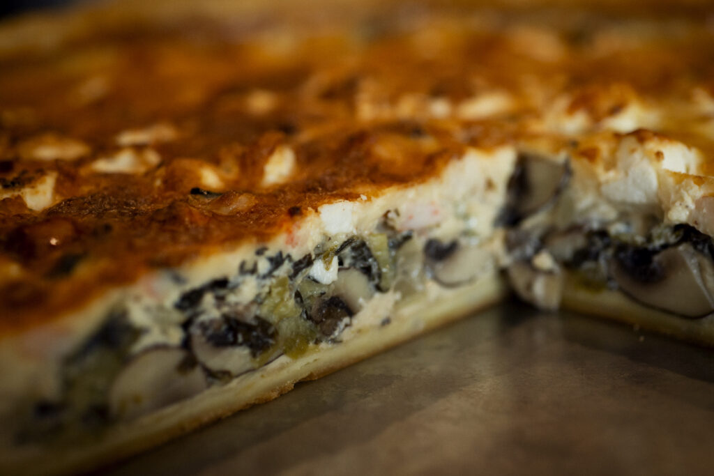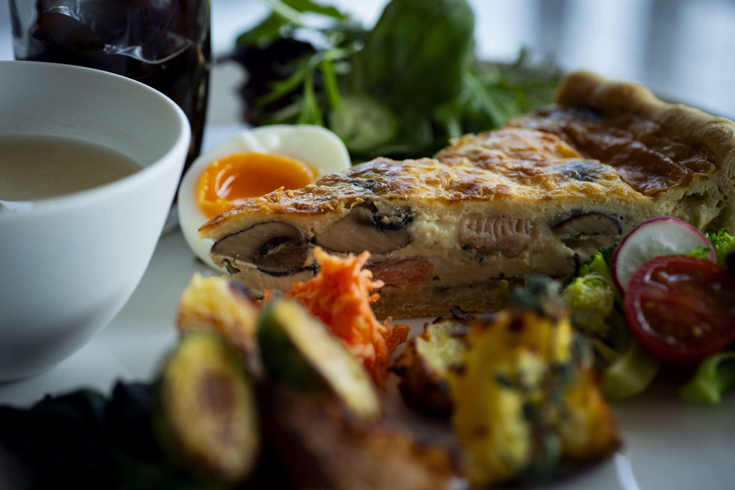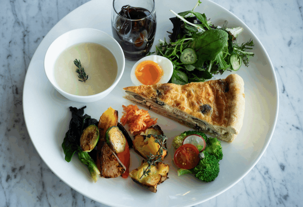米粉を使ったグルテンフリーのキッシュプレート。これまでも人気だったキッシュの生地を米粉にしたことで、サクサクの食感にグレードアップしました。季節の食材がたっぷり入ったキッシュと野菜のアラカルト、デザートまで楽しめる大満足な一品です。