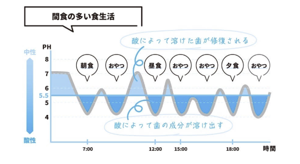 ほとんどの食べものには糖質が存在します。つまり、食べている時間が長ければ、それだけ虫歯菌に栄養を与えているということになります。これにより、口の中が酸性に傾いたままになってしまい、唾液の力による歯の修復(再石灰化)が追いつかずに虫歯が進行していきます。