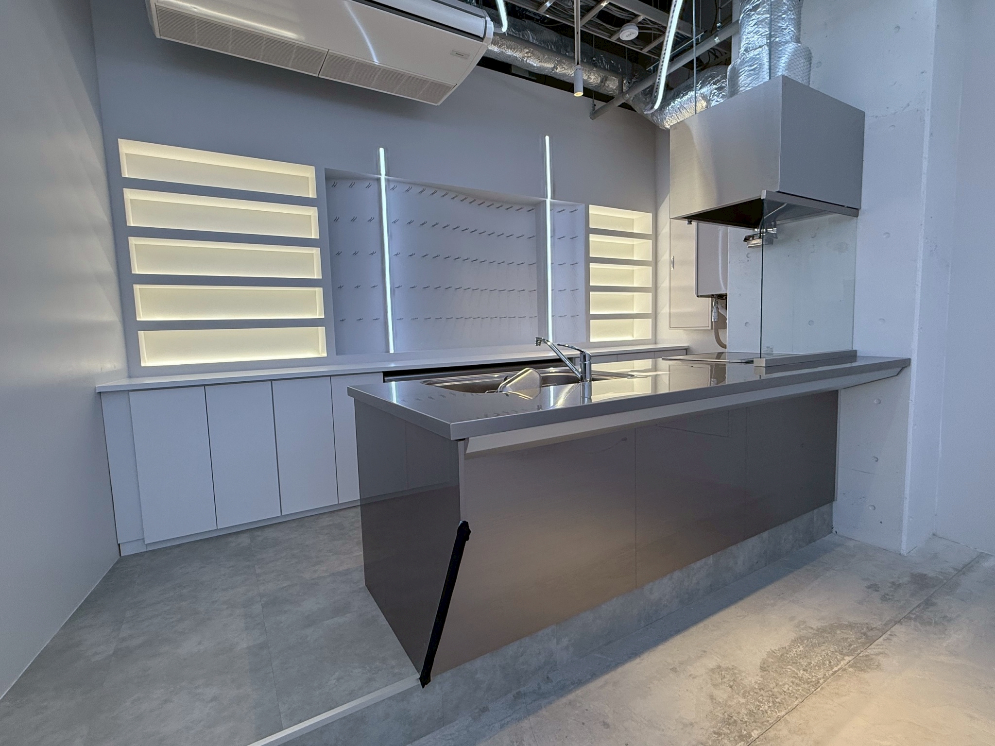 ステンレスのアイランドキッチンやプロジェクターなどの設備を備え、展示会やイベントなどに幅広く対応。