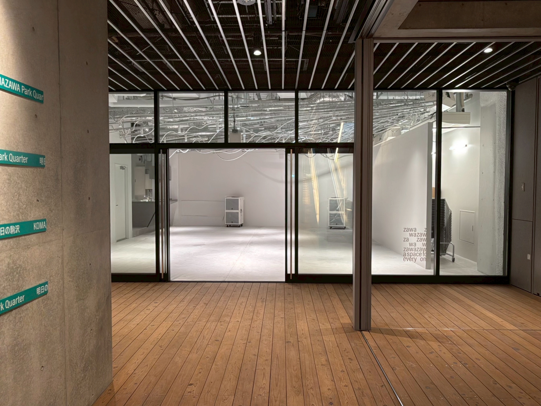 KOMAZAWA Park Quarter地下に位置する約100㎡のスタジオ「zawazawa」は、コンクリートの質感とネオン風照明が印象的な多目的スペースです。